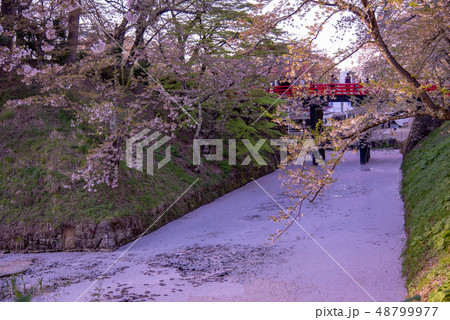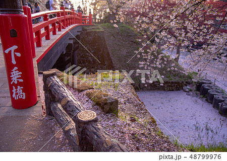 青森 弘前城の花筏 お濠 桜の花びら 赤い橋 下乗橋