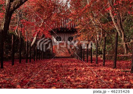 京都洛西の秋 紅葉の地蔵院(竹の寺) 散り紅葉の総門と参道