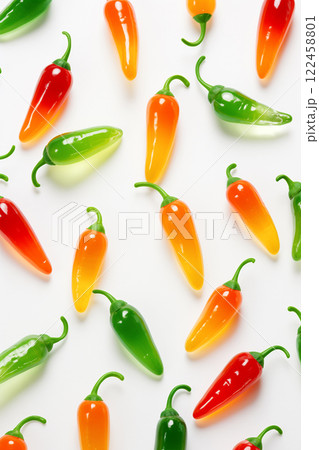 Colorful glass peppers scattered on white creating a fun background. Many shiny orange and green vegetable shaped decorative elements, flat lay. AI-generated