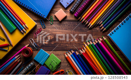 Colorful School Supplies on Wooden Desk. Back to School Concept. Generated image