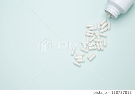 Bottles with capsules scattered on a light blue background. Concept of medicine, healthcare, and pharmaceutical industry