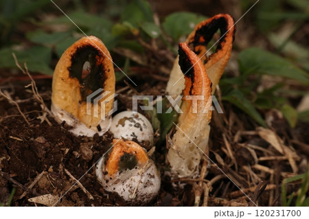 自然 茸 カニノツメ、新鮮な状態の成菌。悪臭を放ってハエなどを誘引し、胞子を運んでもらいます