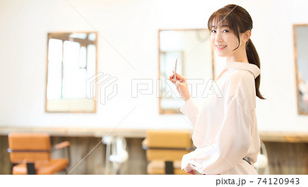お客の髪を切る女性ヘアスタイリスト ヘアサロン 美容室 イメージ