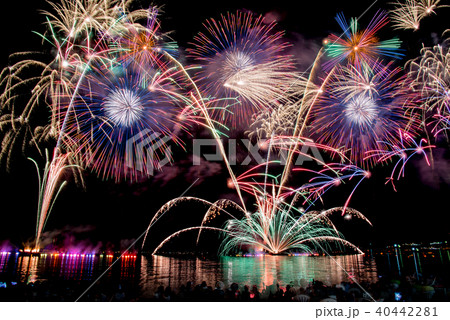 福井 敦賀 気比海岸 とうろう流しと大花火大会 海に落ちる二尺玉 花火大会を見物する人々