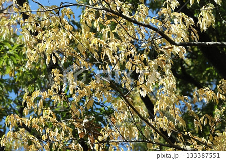 自然 植物 イヌザクラ、十一月下旬の姿。陽ざしを受けた黄白色の葉が美しい