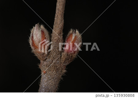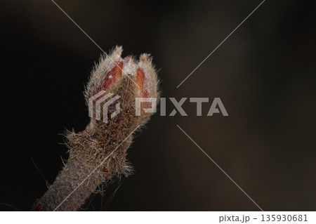 自然 植物 ガマズミ、一月の冬芽。毛に覆われた芽鱗の隙間から赤い新芽が見えます