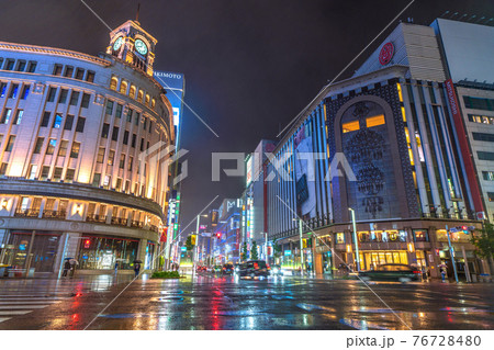日本の東京都市景観 まん延防止下。解除後最多続出…夜8時以降、雨でも人出は絶えない=4月17日、銀座