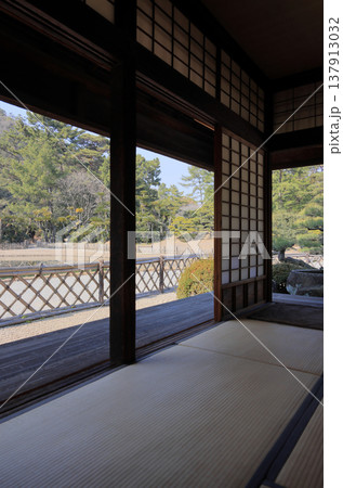 特別名勝「栗林公園」掬月亭の茶室から見る初莚観と庭
