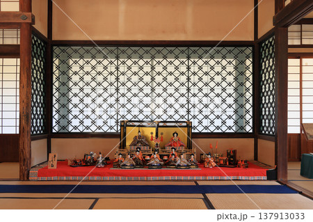栗林公園、掬月亭の初莚観の床の間の雛飾り