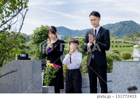 お墓参りをする喪服を着た家族(秋冬)