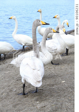 湖に佇む数羽の白鳥、屈斜路湖の白鳥