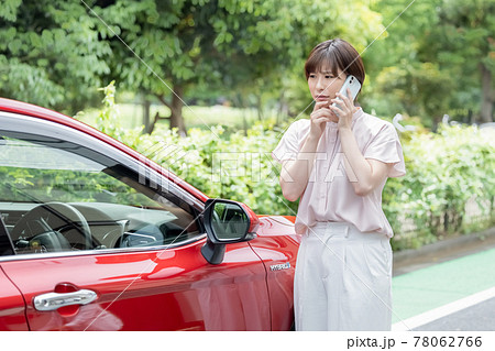 車が故障して電話をかけるミドル女性