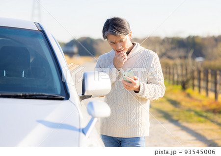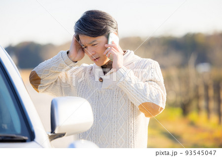 車が故障して電話をかけるミドル男性