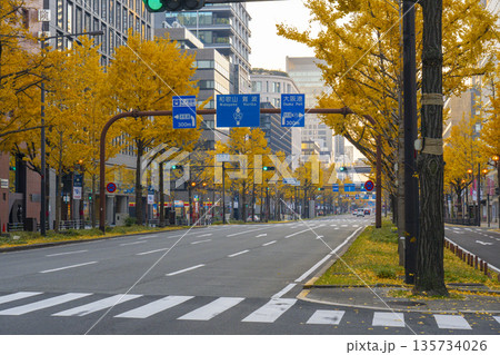 秋の大阪 御堂筋の黄葉したイチョウ並木 心斎橋大丸