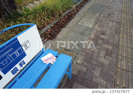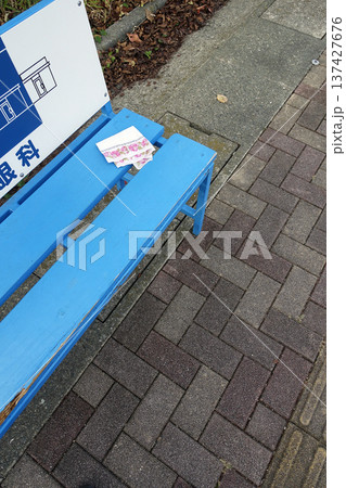 バス停の青いベンチに忘れられた白いハンカチ