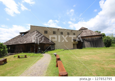 茅葺き屋根とモミジ(福島県・いわき市)