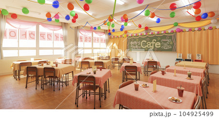賑やかに飾り付けられた文化祭当日の教室 / スクールイベント・青春とノスタルジーのコンセプトイメージ