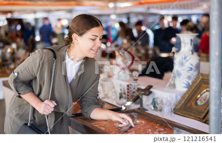 Portrait of smiling young woman choosing vintage goods at flea market