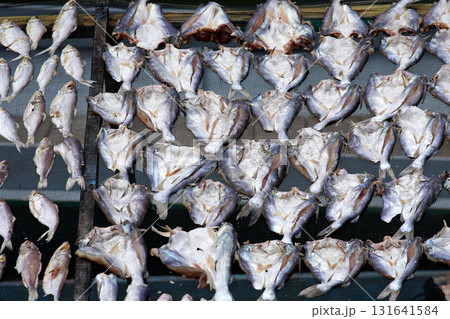 Fresh fish drying outdoors in the bright sunlight