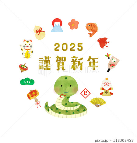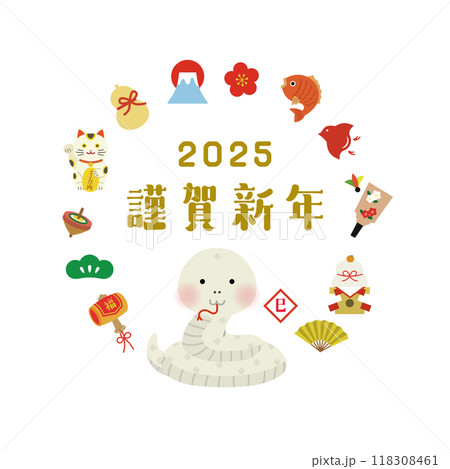2025 年賀状テンプレート - 数字を形取ったヘビと縁起物アイコン