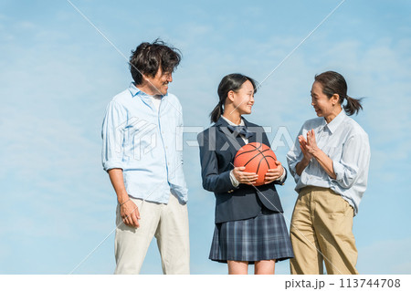 中学生・高校生と両親の家族・ファミリー(部活・バスケ部・文武両道・両立・応援)