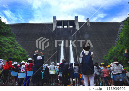 ダムの観光放水。課外授業の小学生の子供達は感激してバンザイをする子も。