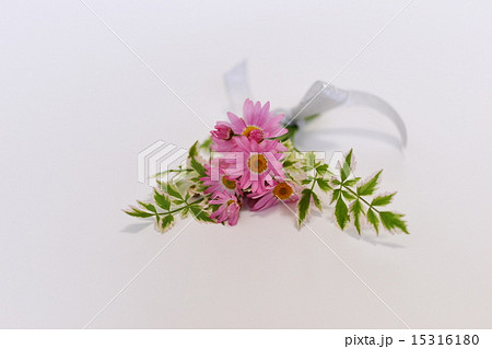 白い床に置かれたピンクのマーガレットと斑入りセリの小さな花束