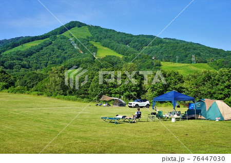 無人の非圧雪コースから見渡すスキーリゾートのパノラマ風景 (新潟県、斑尾高原)