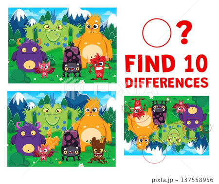 Find ten differences between funny monster characters landscape. Matching details, objects comparing riddle game vector worksheet. Spotting quiz with hairy spooky monsters, creepy creatures characters