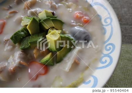 ホタテシチューの上にアボガドをのせて