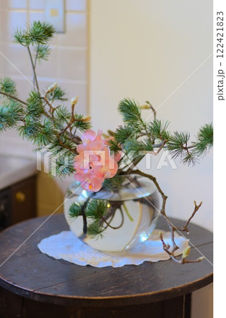 洋館のテーブルに飾られた桃色胡蝶蘭と松の生け花