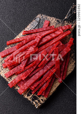 Jerky or dried chicken and cherry snacks. Dehydrated, dried snacks for beer