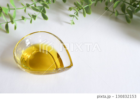 オリーブオイルの瓶とオリーブの実とガラスの小皿に注がれたオリーブ油