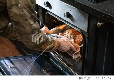 Man baking chicken in oven for family meal. Home cooking concept for domestic life. Culinary education and recipe preparation.