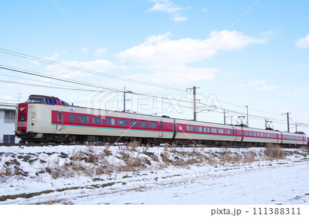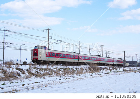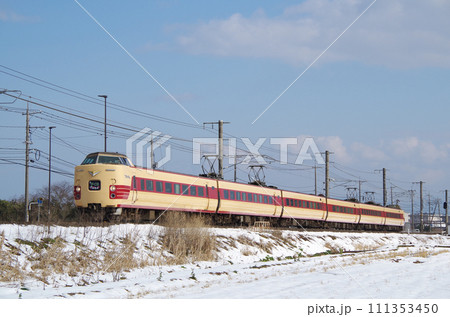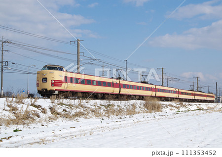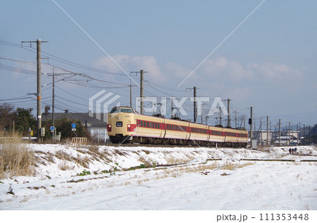 雪の積もった田園の土手を駆け抜ける復刻版旧国鉄色の381系特急やくも号