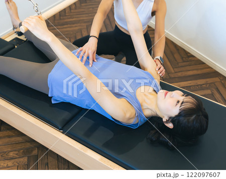 パーソナルトレーナーに腹筋トレーニングの指導を受ける日本人女性