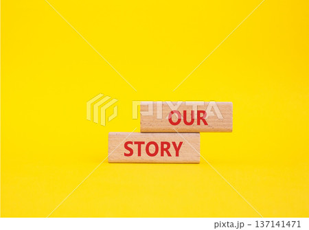 Our story symbol. Wooden blocks with words Our story Beautiful yellow background. Business and Our story concept. Copy space.