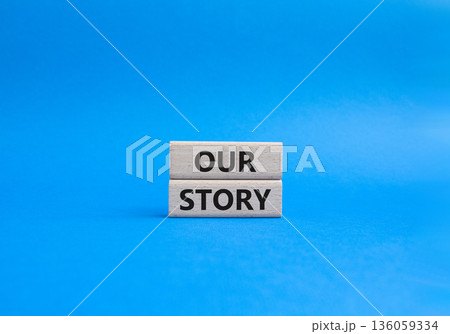 Our story symbol. Wooden blocks with words Our story Beautiful blue background. Business and Our story concept. Copy space.
