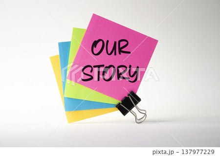 Our story symbol. Pink sticky note with words Our Story. Beautiful white background. Business and Our story concept. Copy space.