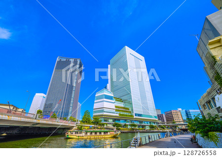日本の横浜都市景観 桜木町駅前の横浜市役所やザ・タワー横浜北仲、大岡川の屋形船などを望む