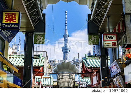 日本の東京都市景観 東京・浅草の新仲見世から東京スカイツリーなどを望む