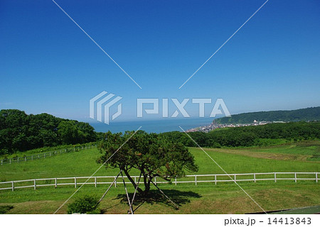 夏の青空と競走馬(サラブレッド)生産牧場 イメージ 北海道