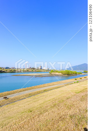 青空を背景に映える球磨川分流堰の新前川堰から観える風景「八代市」