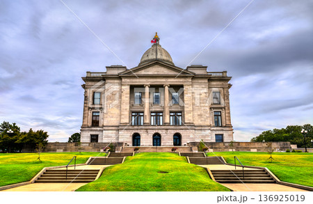 Arkansas State Capitol building in Little Rock. Historic Neoclassical government architecture features a limestone facade and dome under a blue sky with clouds