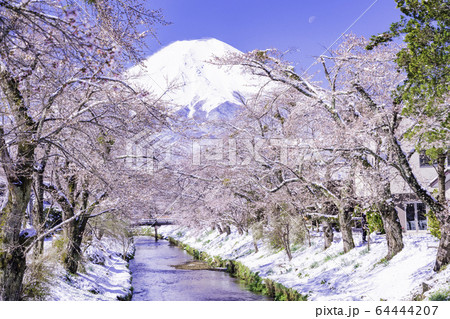 風景 山梨県南都留郡忍野村 新名庄川 富士 桜