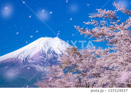 《山梨県》富士山と桜満開の新名庄川・忍野村