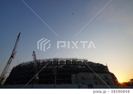 日本の東京都市景観「夕日を浴びる建設中の新国立競技場」関連写真検索キーワードは、新国立競技場関連写真