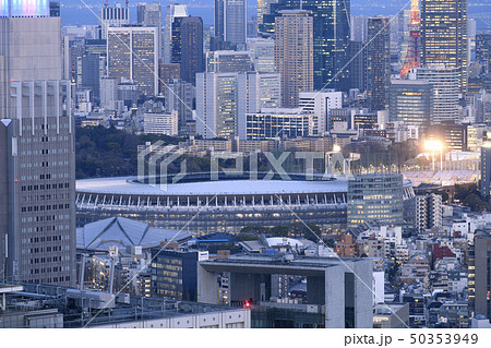 日本の東京都市景観「夕日を浴びる建設中の新国立競技場」関連写真検索キーワードは、新国立競技場関連写真