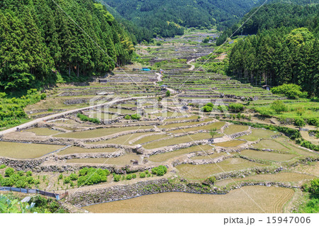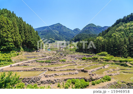 青空に映える棚田の水田(四谷千枚田/愛知県新城市)