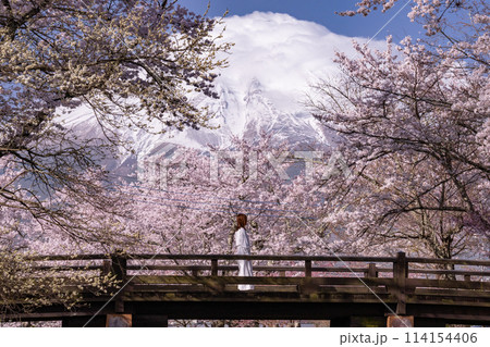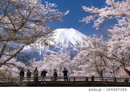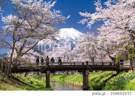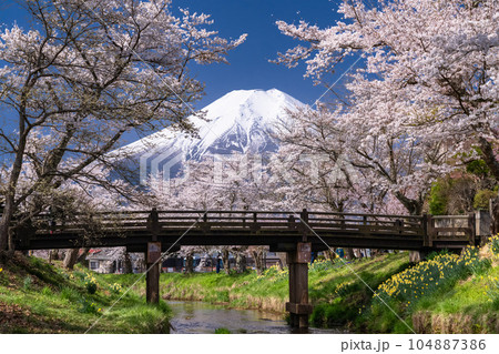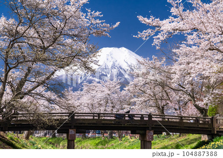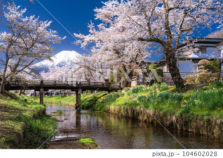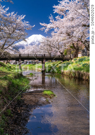 《山梨県》富士山と桜満開の新名庄川・忍野村